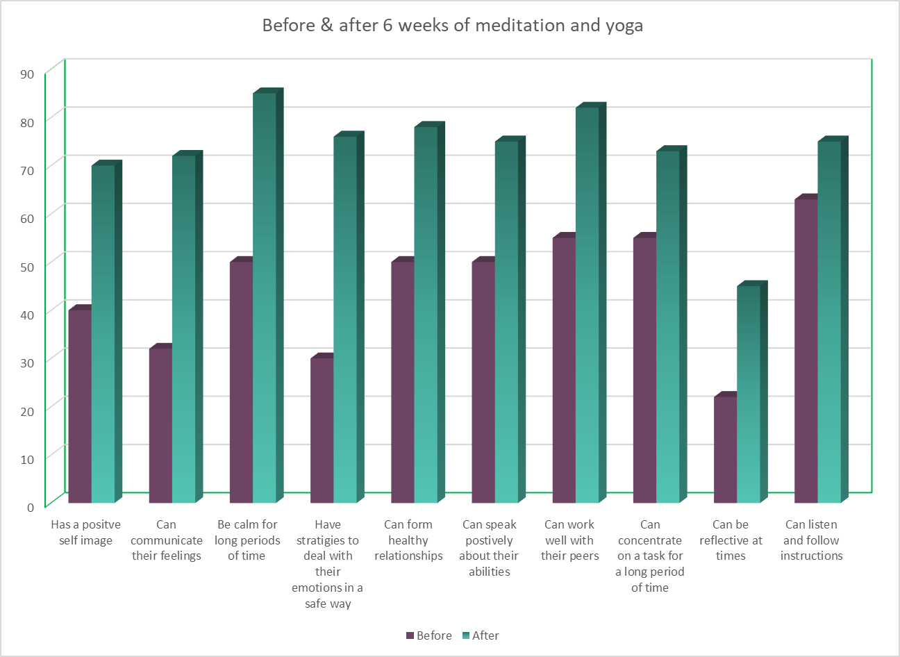 Students who participate in regular Yoga sessions were calmer for longer periods of time, were more reflective and could listen and follow instructions better.